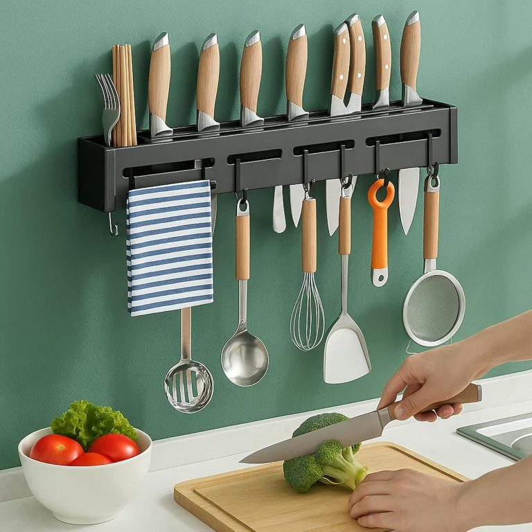 Kitchen Shelf Advanced Non Rust Stainless Steel Alloy Wall Mount Knife Holder, Towel Hanger, Cutlery Holder Storage Rack High Grade Metal Multi-Purpose (40 x 5.5 x 7cm)