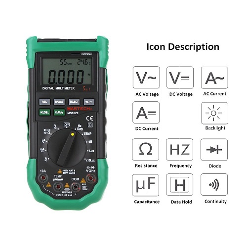 MS8229 is an improved and modified version of the widely praised Mastech MS8209, it combines a multimeter, a sound level meter, thermometer, lux meter, humidity meter all in one. Also it is packed with manMy nice features such as temperature & humidity display, sound and light warning for the jacks and back-lit LCD Screen. Built-in Temperature & Humidity Sensors show you the environmental temperature and humidity.