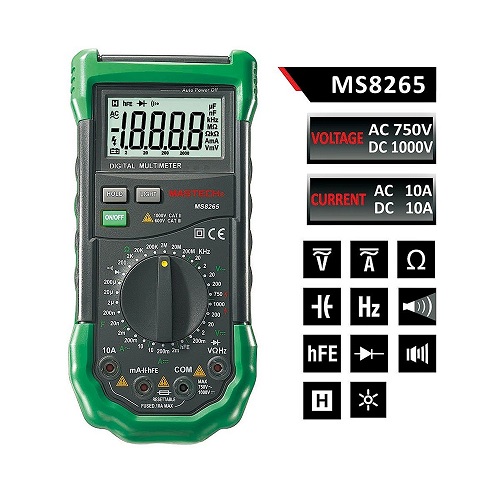 Large 20000 counts LCD display. Measures AC or DC voltage and current, resistance, capacitance, frequency and duty cycle. Sound and light warning for incorrectly inserting the input plugs. Transistor (hFE) check, diode and continuity test. Data hold and display back light. Power Supply: 1 x 9V 6F22 battery. Product Size: 195 x 92 x 55mm (7. 7 inch x 3. 6 inch x 2. 2 inch).