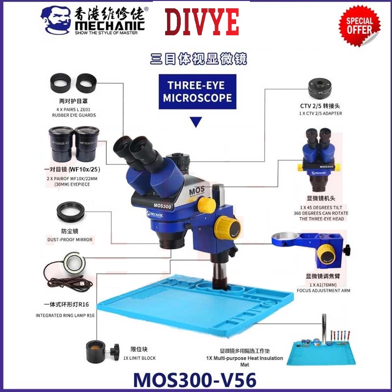 The Mechanic MOS300-V56 microscope is a high-quality mechanical instrument designed for precise scientific observations. Its advanced features include adjustable magnification levels, fine-focus controls, and a robust mechanical stage for sample manipulation. With its exceptional optics and durable construction, the MOS300-V56 microscope offers researchers and scientists a reliable tool for detailed microscopic investigations.